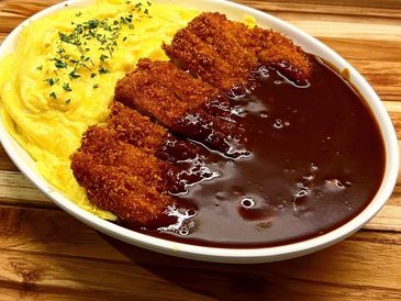 Chicken Katsu in a rich demi-glace sauce, served over rice and topped with a fluffy omelette.